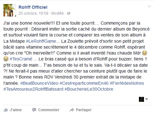 Sur Facebook, le rappeur du 94 a déclaré que Booba profitait de la sortie de son prochain projet "Rohff Game" pour faire du Buzz.