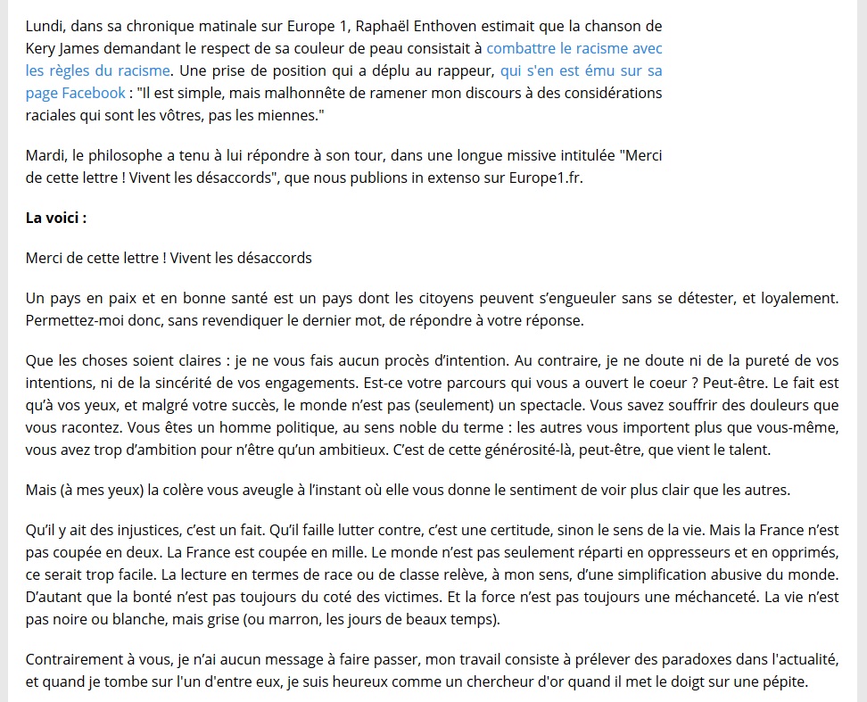 En début de semaine, Raphaël Enthoven avait visé Kery James dans un billet sur les ondes d'Europe 1.