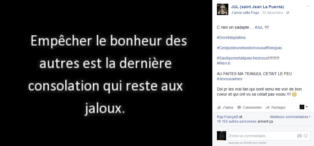 Jul s'est donc dit désolé pour ses vrais fans sur sa page Facebook :