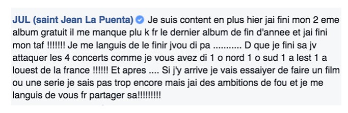 Jul est toujours au top de l'actualité musicale, ce dernier a annoncé sur son compte Facebook qu'il sortirait un album gratuit le 1er Avril prochain !