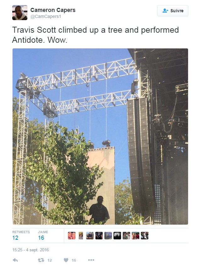 En bon entertainer du game US, Travis Scott a joué à ''chat-perché'' au moment de prendre le micro. Un concert depuis un arbre, comme cela, de manière spontanée. Franchement, fallait y penser...