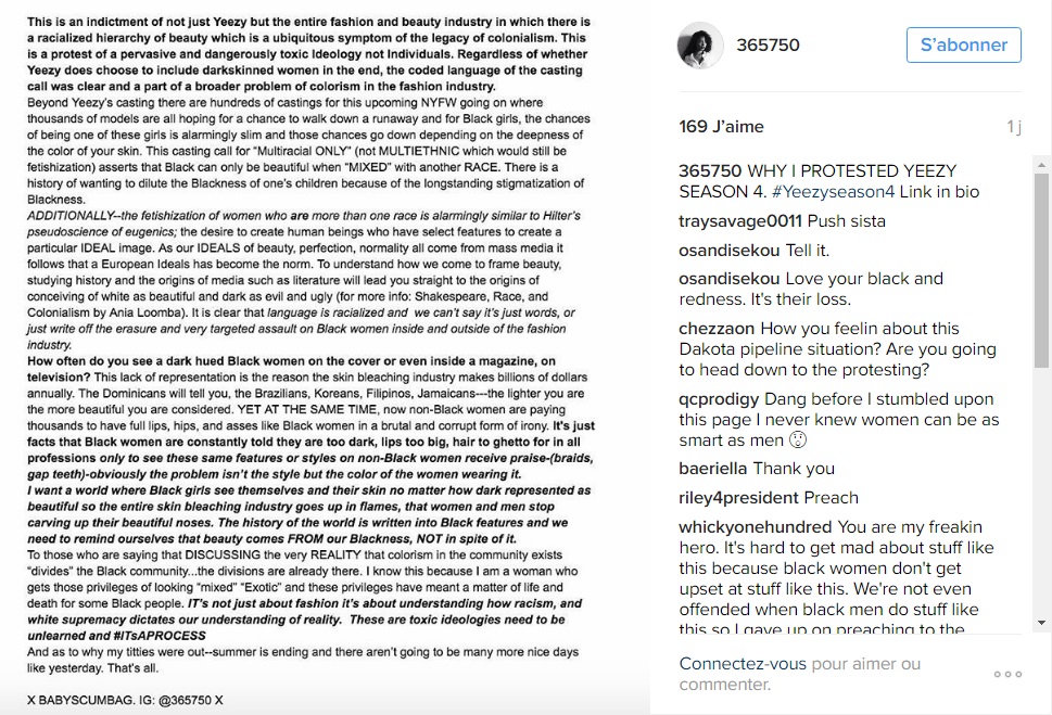 Sur Instagram, celle qui se fait appeler Baby Scumbag' a d'ailleurs déclaré ceci : ''Le monde de la mode et de la beauté est installé dans une hiérarchie raciale issu du colonialisme. (...) La mode ne veut pas de peaux trop sombres''.