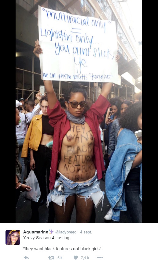 Ainsi, une jeune femme est allée jusqu'à manifester sein nu lors du fameux événement pour dénoncer le choix de monsieur West. A la façon d'une Femen, elle a voulu dénoncer ''l'héritage colonialiste'' que le rappeur et designer poursuit.