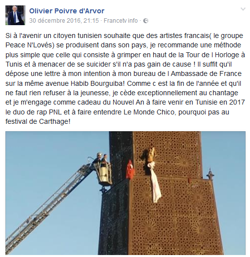 Il ne s'est pas arrêté la puisqu'après avoir déclaré qu'il ne fallait rien refuser à la jeunesse, il a invité les fans tunisiens d'artistes français à déposer une lettre à son attention au bureau de l'ambassade. Une démarche qui, certes peut prendre un peu plus de temps, mais nettement moins dangereuse.
