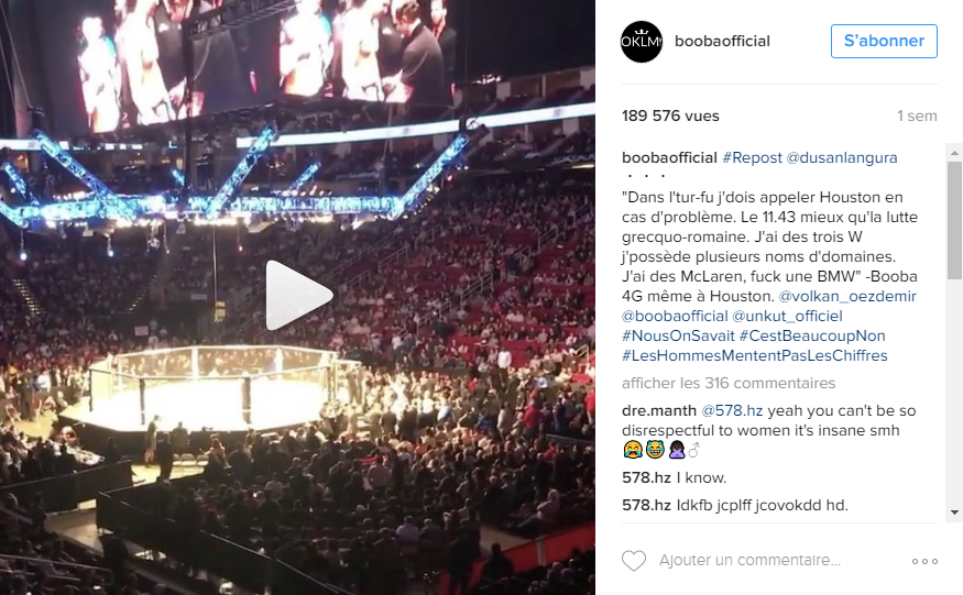 C’était la semaine dernière lors d’un combat UFC à Houston, dans le Texas, que le morceau 4G de Booba a été diffusé. Une dédicace d’un sportif que le rappeur n’a pas hésité à relayer sur les réseaux sociaux.