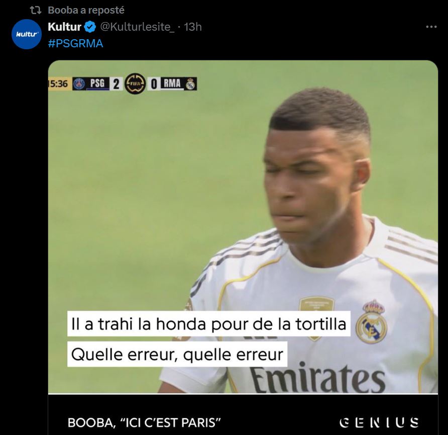 Hier soir avait en effet lieu la demi-finale de la coupe du monde des clubs entre le Real et le PSG. La compétition se déroule aux Etats-Unis, et on imagine que les Merengues se souviendront longtemps de leur voyage américain de l'été 2025, puisqu'ils viennent de manger un violent 4/0 infligé par Ousmane Dembélé et ses coéquipiers. Fantomatique pendant le match (comme toute son équipe), Mbappe est évidemment la cible de toutes les critiques, notamment de la part de Booba, qui ne le lâche pas.
