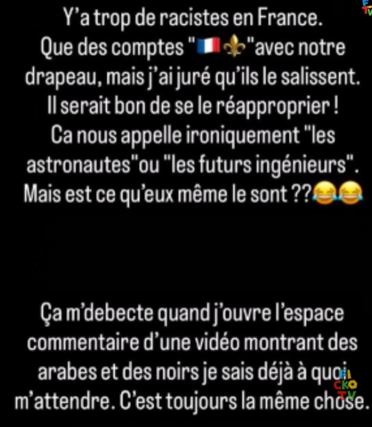 Dans un second message, il en a également profité pour allumer un Youtubeur d'extrême droite, qu'on ne nommera pas pour ne pas lui faire de pubs. Là où il met aussi le doit sur quelque chose d'intéressant, c'est lorsqu'il parle de ce terme "ingénieur", utilisé ironiquement pour sous-entendre que tous les descendants d'immigrés seraient des "cassos". Comme souvent, les français racistes attendent de la part de leur immigration quelque chose qu'ils ne sont eux-mêmes pas capable de faire, du genre être médecin ou ingénieur, ce qui ne concerne qu'une infime partie de la population française "de souche" (qui n'existe quasiment pas d'ailleurs : la France a historiquement toujours été une terre d'immigration).