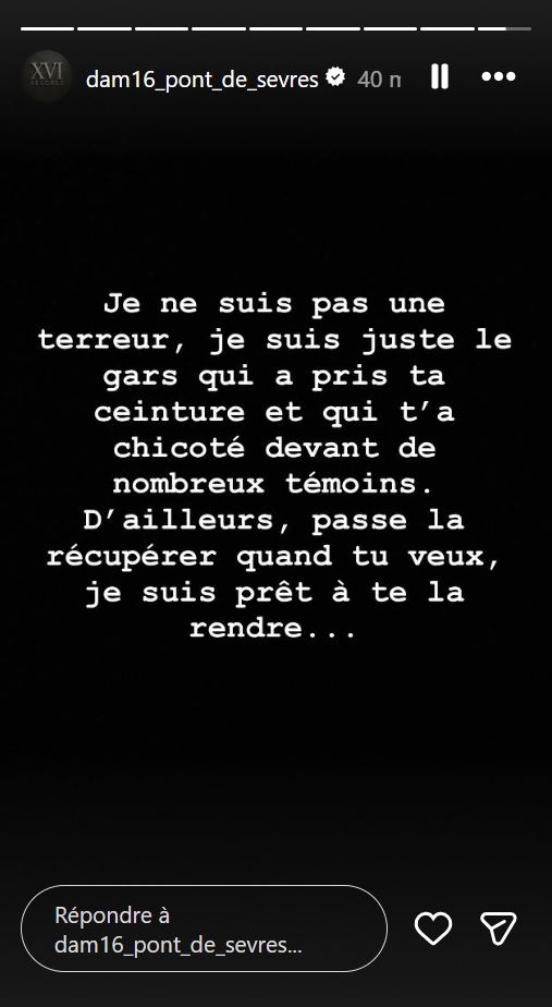 Dans la suite de sa story, Booba a aussi écrit : "Y pensent tous que Dam16 c'est une terreur". Evidemment, Dam16 s'est empressé de répondre, lui aussi en story :