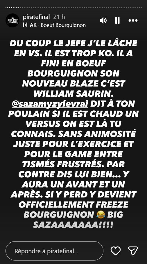 Du coup Jefe j'le lâche en VS. Il a fini en boeuf bourguignon son nouveau blaze c'est William Saurin. Sazamyzy, dit à ton poulain si il est chaud un versus on est là tu connais. Sans animosité juste pour l'exercice et pour le game entre tismés frustrés. Par contre dis-lui bien, y aura un avant et un après. Si y perd y devient officiellement Freeze Bourguignon !