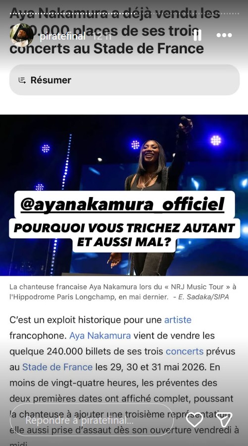 Un compliment inattendu de la part de B2O, même si il faut avouer que l'album de La Rvfleuze est plutôt bon, mais on sent que c'est surtout un prétexte pour Kopp, de féliciter un rappeur qui fait des scores "normaux", en attaquant d'un autre côté ceux qui, selon lui, trichent pour gonfler leurs stats. Et parmi les tricheurs, Booba a décidé de viser Aya Nakamura en particulier, au sujet de ses Stades de France. Ses 3 concerts dans la plus grande enceinte française avaient pourtant été annoncés complets par une partie de la presse... sauf que des places viennent d'être remises en vente.