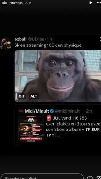 Le rappeur a également publié une autre vidéo sur son compte X, allant dans le même sens, accusant Jul de truquer ses chiffres et de jouer sur une “faille” du système de comptabilisation des ventes.